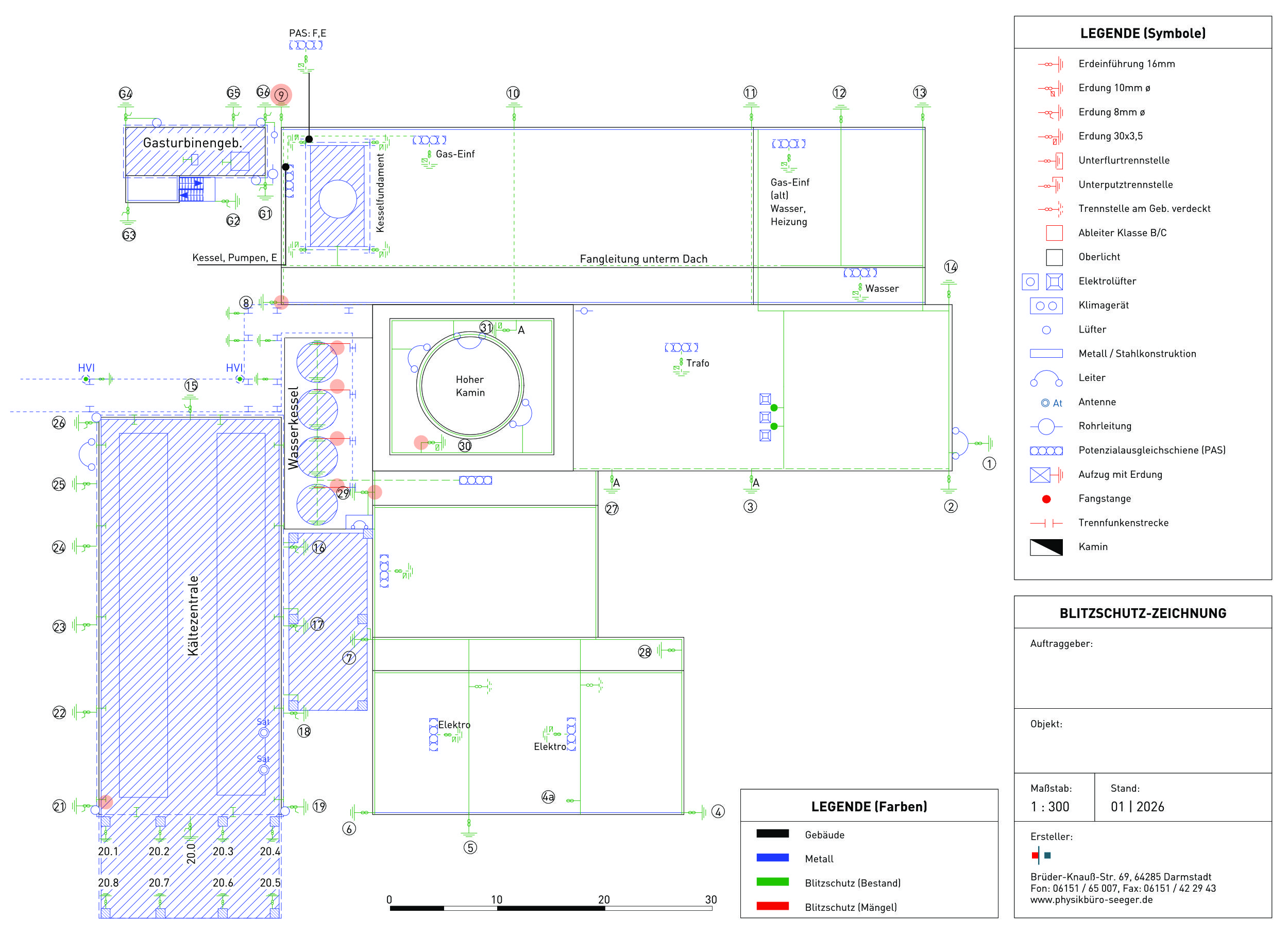 Die Prüfung besteht aus der Sichtprüfung der äußeren BSA sowie des Blitzschutzpotentialausgleichs und der Messung der Erdungswiderstände. Das Protokoll besteht aus einem Bericht und einer Zeichnung, in der die Mängel klar gekennzeichnet sind.